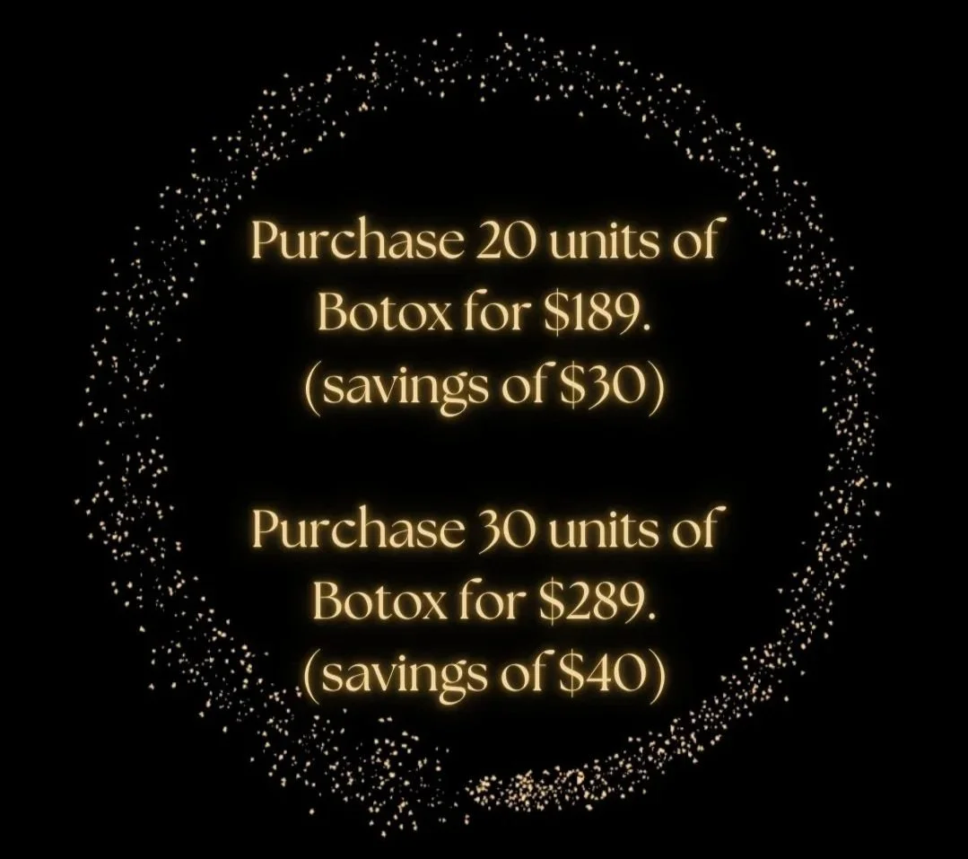 New Year, New Me Savings! (Promotions valid until 1/31/2026) Link to ALL SAVINGS! Schedule Here! Purchase Here! Purchase Here! 20 units - $189 30 units - $289 40 units - $139 60 units - $199 1/2 syringe - $350 Full syringe - $625